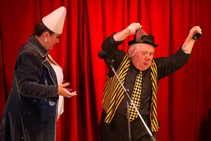Für seinen großen Magie-Trick „Das Tuch“ greift Direktor Kalli Köllner auf David Konyot als Assistenten zurück. Wortreich und mit großen Zaubergesten gehen die beiden Komödianten zu Werke und tatsächlich gelingt das schwierige Unterfangen, ein Tuch – unsichtbar für alle Zuschauer – von der Hosentasche des Einen in die des Anderen zu befördern. Zur Verblüffung der Massen gelingt auch der Rücktransfer – doch dann unterläuft David Konyot ein Fehler.
