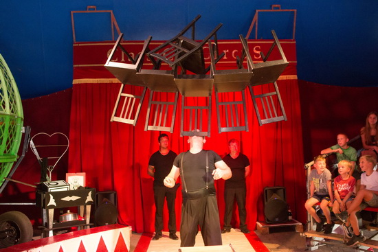 Direktor Kalli Köllner präsentiert rasant ausgeführte Kinnbalancen. Zum Auftakt finden zwei Sektflaschen den Weg auf die Kinnspitze. Es folgen Stühle, die in verschiedenen Positionen auf dem Kinn ausbalanciert werden und schließlich sind es sechs ineinander gehakte handelsübliche Holzstühle, die der Chef des Hauses sicher auf dem Kinn hält. Abschließend nimmt ein Junge aus dem Publikum auf einem Stuhl Platz und auch diese Last balanciert der erfahrene Circusmann sicher auf der Kinnspitze aus.