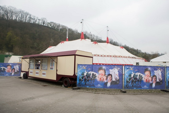 Nicht nur der Name des neuen Unternehmens erinnert an einen traditionsreichen Circus, auch das Chapiteau weckt nostalgische Erinnerungen. Einst prägte die typische Silhouette des Viermasters das Erscheinungsbild des Circus Barum. Einige Materialtransporter und Zugmaschinen sind rings um das Zelt abgestellt.
