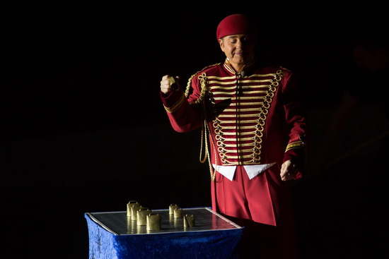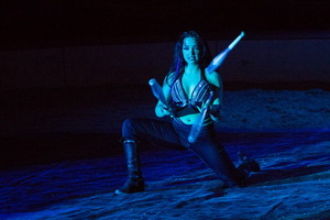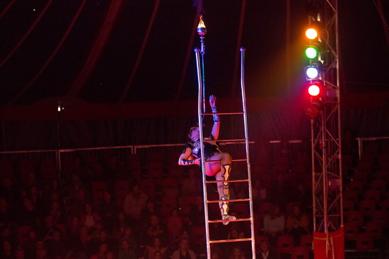 Gewagte Säbelbalancen werden von Maria Bizzarro routiniert ausgeführt. Mit einem auf der Stirn balancierten Schwert überquert die sympathische Artistin eine hohe Leiter. Auf die Spitze treibt sie ihre Balancen, wenn das Schwert mit einem Feuerkelch auf dem Knauf auf eines Dolches, den sie im Mund hält, ruht.