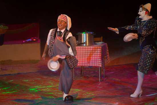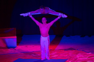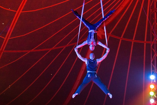Das ukrainische Duo Paschenko ist mit seinen Auftritten zwei Mal in der Manege präsent. Zunächst ist die kraftvolle Partnerakrobatik an den Strapaten in der hohen Kuppel des Chapiteaux zu erleben. Nach einigen raumgreifenden Flügen beider Artisten folgt eine Vielzahl kraftzehrender Partnertricks in der Luft.