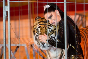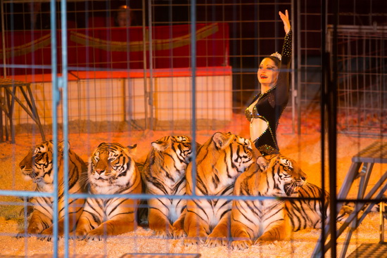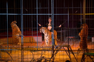 Den Höhepunkt des Programms bietet Carmen Zander mit ihrer erstklassigen Tigerdressur. Hochkarätige Tricks werden in Fülle präsentiert. Eine Vielzahl verschiedener Sprünge ist die Basis der Darbietung. Besonders hervorzuheben ist der Sprung über die Dompteurin, aber auch die Sprünge über vier Artgenossen und über einen hochsitzenden Tiger sind nicht alltäglich. Neben Hochsitzern und effektvollem Rückwärtssteiger beinhaltet die Nummer eine Reihe risikoreicher Kontakttricks. Futterabnahme von einem Mundstab und direkt aus der Hand sind hier genauso zu nennen, wie der als Da Capo gebotene „Tigerkuss“. Ein attraktives Bild bietet der Ritt auf einem Tiger, ohne mit den Füßen Halt zu haben, während zwei weitere Katzen flankierend hochsitzen. Chapeau.