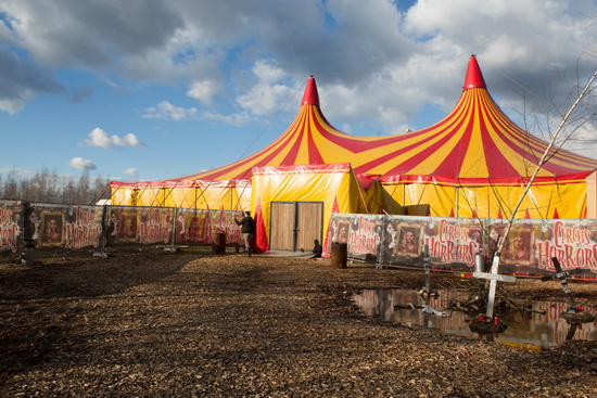 Die großen gelb-rot gestreiften Zeltanlagen des Unternehmens dienen auch in diesem Jahr wieder als Spielstätte. Ein hoher mit Spannbändern, sie zeigen das Plakatmotiv der Show, bestückter Zaun schließt das Gelände ab. Vor dem Zaun hat der große Kassenauflieger seinen Platz. Die frischen, seitlich des Eingangs aufgeworfenen Grabhügel mit ihren hölzernen Kreuzen ragen als kleine Insel aus einem Tümpel, der sich nach den ergiebigen Regenfällen der letzten Tage gebildet hat. Hinter den aus rohem Holz gezimmerten Eingangstoren wartet die Dunkelheit einer Gruft auf die Eintretenden. Das "Labyrinth des Grauens" wartet darauf, im Schein flackernder Funzeln, untermalt von schaurigen Klängen überwunden zu werden. Skurrile Gestalten treiben dort ihr Unwesen; Vampire und Zombies harren in den Winkeln auf ihre Opfer. Im Vorzelt, in dem Spinnennetze, Skelette und riesigen Spinnen ein unheimliches Ambiente schaffen, lauern weitere Untote den Besuchern auf. Entlang der Zeltseiten sind die Holzbuden, in denen die Circusrestauration untergebracht ist aufgestellt und eine große Bar nimmt die Mitte des Raumes ein. Durch einen hohen roten, reich geschmückten Samtvorhang tritt man in den Zugang zum Chapiteau. Dort stehen das große bekannte Gradin mit Einzelklappsitzen und Logen mit Polsterstühlen für die Besucher bereit. Zu Beginn dieser Saison wurde eine neue Bühnenkonstruktion, die in diesem Circus an Stelle einer Manege Verwendung findet, in Betrieb genommen. Die neue Bühne ist gegenüber dem Vorgänger optimiert, so dass sich die Montage einfacher gestaltet. Zudem sind Vorrichtungen für Feuer- und Nebeleffekte installiert und die mittlere Fläche lässt in die Höhe fahren.