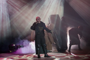 Nebel wabert durchs weite Rund und dumpfe Beats lassen den Magen vibrieren, während im fahlen Licht zwei gehörnte Dämonen eine Kutsche auf die Bühne ziehen. Der mitfahrende Totengräber öffnet den transportierten Sarg und Nosferatu, die Figur wird weiterhin von Giovanni Biasini verkörpert, tritt „sein