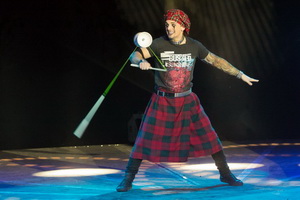 Diabolo-Jongleur Georgio Hromadko erobert in rasantem Tempo die Bühne. In einem wilden Wirbel reihen sich die verschiedenen Figuren, deren Schwierigkeitsgrad permanent gesteigert wird, aneinander. Schließlich hält der sympathische junge Mann vier Diabolos zur gleichen Zeit souverän in der Luft. Den meisten Beifall erhält der versierte Artist allerdings nicht für seine hochklassigen Leistungen sondern für das ablegen des über der Hose getragenen Kilt.