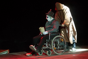 Clown „Malefizius“, Milano Kaiser spielt diese Rolle in höchst überzeugender Weise, wird zu seinem ersten Entree im Rollstuhl auf die Bühne geschoben, um bald darauf seinen Auftritt als Fußgänger fort zu setzen. Zunächst dürfen sich, zum großen Gaudi des übrigen Publikums, einige Logenbesucher an einem „gebrauchten“ Tampon erfreuen, dann treten sie in engen Kontakt mit lebenden Kakerlaken. Ein flott requirierter „Freiwilliger“ muss mit angelegtem Halsband und Leine einen Hund mimen und wird nach Domina-Art „bestraft“. Anschließend wird er mit verbundenen Augen vor ein Messerbrett gestellt und steht auch diese Prozedur furchtlos durch.