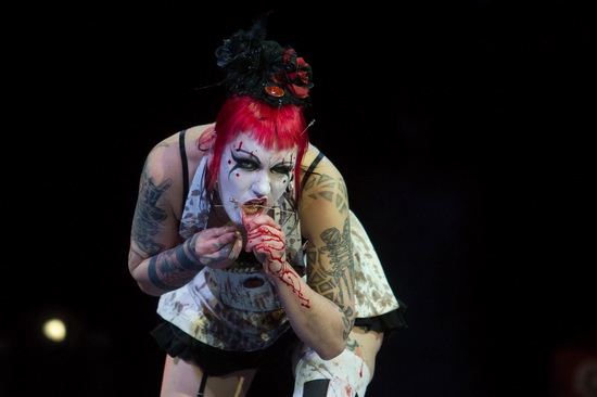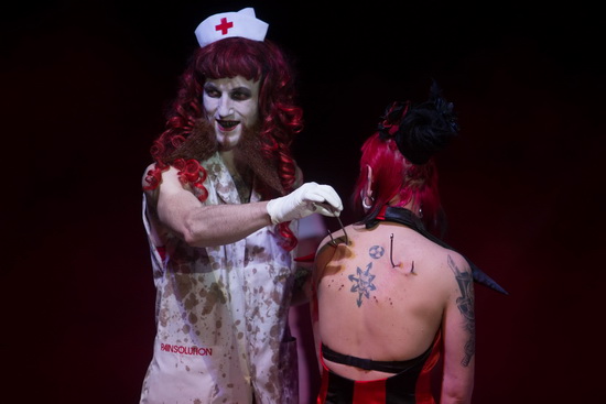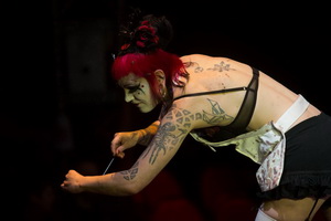 Eine junge Frau tänzelt ins helle Licht des Spots, derweil fünf, reichlich zehn Zenitmeter lange Nadeln tief in ihrer Stirn stecken. Ohne zögern und ohne erkennbare Zeichen von Schmerz nimmt sie, dicht vor den Logen umherwandernd, nacheinander weitere dieser Metallspieße zur Hand, sticht sie sich drei von ihnen dicht nebeneinander quer durch den Unterarm und lässt die Spitzen auf der anderen Seite wieder austreten. Zwei Nadeln durchbohren die Haut zwischen den Fingerknöcheln der linken Hand. Blut fließt über ihr maskenhaft weiß geschminktes Gesicht, als sie nacheinander die Nadeln aus der Stirn zieht und diese durch Wangen und Mundhöhle führt. Die letzte Nadel durchbohrt die Haut vor ihrem Kehlkopf.