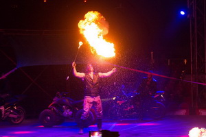 Spektakuläre Motorrad- und Feuerartistik wird zum Programmhöhepunkt geboten. Auf schweren Maschinen donnern die Sperlich Brüder auf die Szene und Milano Kaiser jagt mit seinem Quad hinterher. Fredy Peters bietet auf seiner Maschine riskante Sprünge. Aus dem Vorzelt nimmt er Anlauf und von einer steilen Rampe im Eingangsbereich gehen die Flüge quer durchs Zelt und werden auf einer weiteren Rampe am Artisteneingang gelandet. In der Luft schwebt Peters über seinem Motorrad und zeigt verschiedene waghalsige Stunts. Zwischen den Sprüngen, wenn das Motorrad zurück zur Startposition rollt, arbeitet Milano Kaiser seine Feuershow und schickt gewaltige Feuersäulen aus seinem Mund Richtung Kuppel.