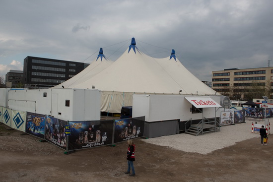 Auf dem Circusplatz der Metropole am Rhein war ein weißes Chapiteau von vierundvierzig Meter Durchmesser als Spielstätte aufgebaut. Dicht wird das Zelt von zahlreichen Wohn- und Transportwagen sowie den Unterkünften der vierbeinigen Stars der Show umringt. Ein hoher mit Spannbändern, die das Plakatmotiv der Show zeigen, versehener Zaun schließt das Gelände ringsum ab. In einem weißen Sattelauflieger hat die Abendkasse ihren Platz und ein hohes bogenförmiges Portal gewährt den Besuchern Einlass in den Zeltbau. Die Restauration ist im Bereich zwischen Gradin und Rondell ins Spielzelt integriert. Ein neunreihiges Schalensitzgradin und drei Reihen gepolsterter Klappstühle stehen für die Besucher zur Verfügung.