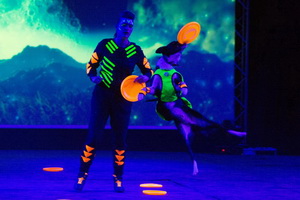 Aus dem Hundesport kommen Jana und Kara, die mit ihren Tieren Dog-Frisbee im Spacelook spielen. Trainerinnen und Tiere tragen neonfarbene Kostüme, bzw. Geschirr und auch die Frisbee-Scheiben leuchten im Schwarzlicht in grellem orange. Geschickt fangen die agilen und spielfreudigen Tiere die Scheiben mit hohen Sprüngen aus der Luft.