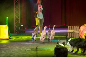 Direkt vor der Pause lernen wir die Hundesportart „Dog Diving“ kennen. Ein rechteckiges, in die Bühne eingelassenes Wasserbassin wird aufgedeckt und von einer flachen Rampe sollen die Vierbeiner möglichst weit ins Wasser springen und ein hineingeworfenes Spielzeug zurückholen. Für diesen Act werden permanent wechselnde Hunde gecastet; in der besuchten Show hatte jedoch offensichtlich keiner der Kandidaten für den Siegespokal Lust auf ein nasses Fell. Mit gekonnten Sprüngen landeten alle drei immer wieder seitlich neben dem Becken und versuchten vom trockenen Ufer aus ihr Spielzeug zu erhaschen. Eine sehr interessante Passage der Show ist der Auftritt der Hütehunde. Die beiden ausgebildeten Border Collie halten die Herde, auf der Bühne war es eine Schar Laufenten, zusammen und treiben sie, stets in Richtung ihrer Trainerin Nadine Quinn in perfektem Zusammenspiel durch Gatter und lassen sie Hindernisse überwinden.