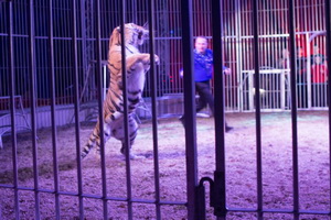 Die Vorstellung beginnt, wie so oft in Frankreich, mit einer Raubtierdressur. Yann Dumas, der jüngere Bruder von Solovich, präsentiert seit Kurzem, eine neue gemischte Gruppe hatte vor einigen Wochen ihre Manegenpremiere, seine beiden Gruppen im täglichen Wechsel. Bei unserem Besuch waren die je zwei Tiger und Löwinnen der bisherigen Formation zu erleben. In einem gekonnt vorgetragenen Ablauf werden Pyramide, verschiedene Sprungvarianten und Hochsitzer, sowie Teppich und Rollover souverän geboten. Ein fulminanter Steiger eines Tigers ist der hervorragende Abschluss der Darbietung.