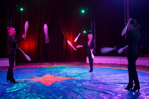 Wenig später sehen wir die junge Frau als Teil des „Trio Caprany“ zusammen mit ihren Schwestern Megane und Steffi mit einer gelungenen Gruppenjonglage. Mit Ringen und Keulen gestalten die Artistinnen ihren jugendlich frisch daherkommenden Auftritt, der eine Reihe interessanter Muster in sicher ausgeführten Routinen bietet. Effektvoll endet die Darbietung mit der Jonglage lodernder Fackeln.