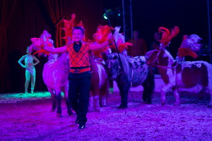 Eine weitere Dressur-Darbietung präsentiert Floy, der zehnjährige Sohn von Yann Dumas. Vier temperamentvolle Shetland-Ponys, die ein umfangreiches Repertoire an Lauffiguren beherrschen, werden von dem souverän und gekonnt agierenden Nachwuchstierlehrer in erstklassiger Weise vorgeführt. Ein gelungener Steiger rundet den Auftritt ab. Als Da Capo preschen zwei weitere, jeweils mit einem Makaken berittene, Ponys durch die Manege und zeigen mehrere Barrierensprünge.