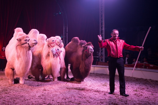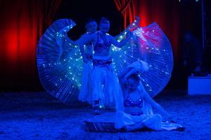 In phantasievollen, per LED-Schnüren leuchtenden Kostümen tanzen die vier Damen des hauseigenen Balletts und leiten zur Kamel-Dressur von Yann Dumas über. Die vier Trampeltiere, mit prächtigem Winterfell, laufen ihre vielseitigen Figuren souverän ab.