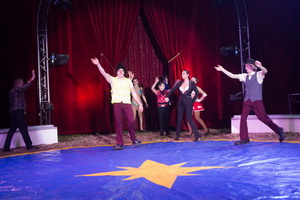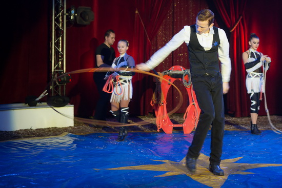 Florian Dumas arbeitet im Zusammenspiel mit zwei jungen Damen einen veritablen Western-Act. Vielseitige Tricks werden mit Lassos gezeigt. Mit kraftvoll geschwungenen Bullpeitschen zerlegt der junge Mann Zeitungsseiten und Papierröllchen in kleinste Teile.
