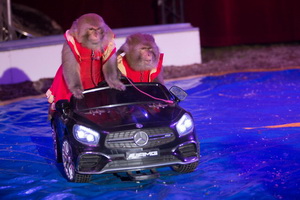Direktor Solovich Dumas lässt zwei Makaken ihr Repertoire vortragen. In einem elektrischen Kinderauto, einem AMG Mercedes Cabrio rollen die possierlichen Affen in die Manege. Sie balancieren über ein „Seil“, tragen Eimer und Flaggen hinüber. Sie fahren Roller und Dreirad und dann kann sich ein Jeder selbst überzeugen, dass sie auch über ordentliche Tischmanieren verfügen.