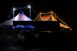 Auf dem Staufenplatz, dem traditionellen Düsseldorfer Circusplatz waren die Zeltanlagen aufgebaut. Ein Zwei-Masten-Zelt, blau-rot gestreift, wurde als Vorzelt eingesetzt und ein hohes rot und weiß gestreiftes Vier-Masten Chapiteau ist die Spielstätte. Ein weißer Stakettzaun, in den der Kassencontainer integriert wurde, schließt das Gelände an der Frontseite ab. Die Wohnwagen und Transportfahrzeuge sind rings um die Zelte aufgefahren.