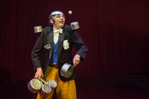 Als Meister des skurrilen Humors erleben wir Misha Usov. Mit seinem feinen, sehr pointiertem Spiel schlägt der Komiker das Publikum mit hervorragend ausgearbeiteten Szenen völlig in seinen Bann. Blechtassen als Epauletten am Jackett, eine Schüssel als Helm und zwei Näpfe auf die Schuhe geschnallt – so kommt er einen Einkaufstrolley ziehend in die Manege und fördert vier Blechtöpfe zutage. Mit Hilfe eines Pingpong-Balls erklingt eine eingängige Melodie auf den Blechgefäßen. Mit dem kopflosen Oberkörper einer lebensgroßen weiblichen Puppe, der in einem Tutu endet, im Arm und zwängt sich Usov durch Gradinreihen in die Manege. Dort verharrt bereits das Puppenunterteil, der Clown vereint die Hälften und tanzt mit seiner Primaballerina eine Weile, dann nimmt er sein Oberteil und schreitet langsam durch den Vorhang. In einer weiteren Szene jongliert er mit Plastiktüten zu Schwanensee. Nach poetischem langsamen Beginn wird das Ballett immer schneller und immer mehr weiße Tüten fliegen umher. Aus einigen wird ein stilisierter Schwan geformt und die Musik endet. Natürlich weist die Direktion per Durchsage darauf hin, das im Sinne der Nachhaltigkeit und Umwelt zuliebe immer wieder die gleichen Tüten genutzt werden.