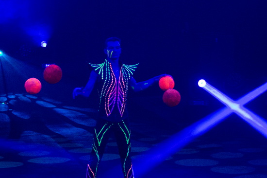 Eine formidable Horizontaljonglage zeigt Ludvik Navratil. Ufos gleich schweben im Schwarzlicht neonrot schimmernde Bälle, an beinahe unsichtbaren Fäden hängend, durch den abgedunkelten Raum. Das mit einem reichen Muster aus winzigen Lichtpunkten dekorierte Kostüm des Jongleurs unterstreicht die futuristische Atmosphäre und immer weitere Bälle fügen sich in die Muster.