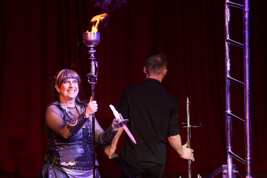 Der zweite Teil der Show beginnt mit den Säbelbalancen von Maria Bizzaro. In einem dynamischen Vortrag präsentiert die sympathische Artistin ihre seit Jahren bestens bekannte Nummer. Souverän werden die Schwerter auf der Stirn, auf der Spitze eines Munddolchs balanciert und mit einem Feuerkelch auf dem Knauf über eine Leiter getragen.