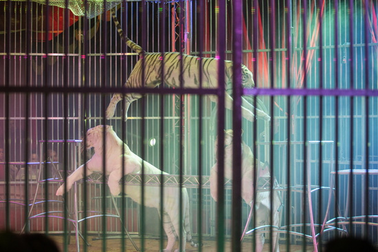 Getreu der Tradition des französischen Circus ist der Zentralkäfig bereits errichtet und Sacha Krosemann jr. präsentiert die drei Tiger des Hauses. Souverän lässt der junge Tierlehrer den trickstarken Auftritt ablaufen. Die vielen verschiedenen Tricks – Pyramide, Teppich, aufrichten am Gitter, Hochsitzer, Balkenlauf, mehrfaches überspringen eines Tieres – erfolgen in erstklassiger Weise. Ein weiter Sprung über die „Tigerbar“ und ein Hochsitzer auf dem Rücken eines zweiten Tigers sind weitere attraktive Elemente der Dressurfolge, die in einem gelungenen Vorwärtssteiger ihren Höhepunkt findet.