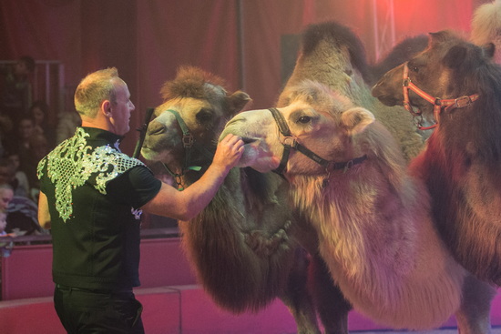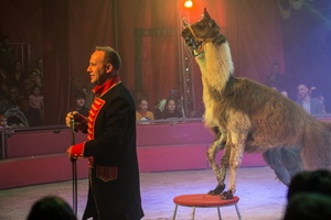 Zwei weitere Dressur-Darbietungen sehen Direktor Sacha Krosemann in Aktion. Zunächst sind drei Kamele in vielseitigen Aktionen zu erleben, ehe im zweiten Programmteil zwei Lamas ihr erlerntes Können zeigen.