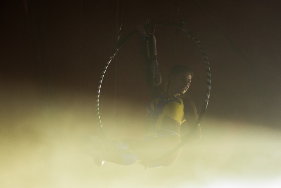 Am Luftring erobert Miss Christina die hohe Kuppel des Chapiteau. In harmonischer Weise reiht sie die verschiedenen Posen aneinander.