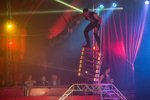 Sacha jr. agiert gekonnt und temperamentvoll auf der Rola Rola. Sicher erfolgen die Balancen, u.a. ruht das Rollbrett auf einem Ball, bzw. türmen sich mehrere Ringe und Rollen aufeinander, auf dem labilen Untergrund. Schließlich errichtet er aus Kegeln und Brettern einen Turm von acht Etagen und balanciert auf diesem fragilen Gebilde in großer Höhe.