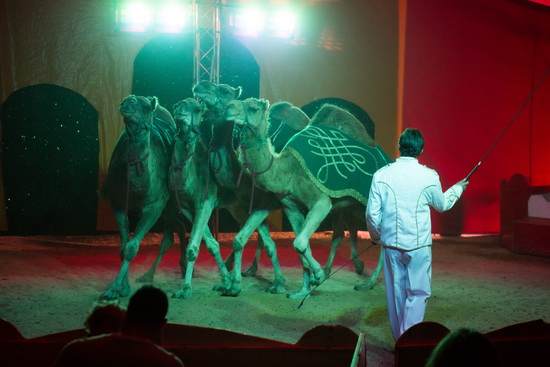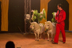 Unter dem Sammelbegriff „La Caravane exotique“ angekündigt, präsentiert Christian Prein junior die weiteren Tierdressuren des Hauses en bloc. Drei Dromedare, mit prächtigen petrolfarbenen Schabracken ausstaffiert, eröffnen das Exotentableau. Abwechslungsreiche Lauffiguren kennzeichnen die harmonisch vorgetragene Dressurfolge.