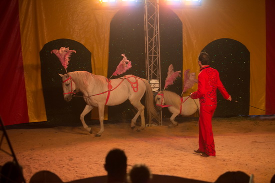 Schnell ist der Käfig entfernt und Monsieur Philippe präsentiert die Cavallerie. Zunächst erfreuen die beiden weiße Ponys Aramis und d' Artagnan die jungen Zuschauer. Ihnen folgt ein weißer Hengst. Bald gesellt sich ein Pony zu der Einzelfreiheit und als ansprechendes Groß-und-Klein nimmt die Nummer ihren Fortgang.