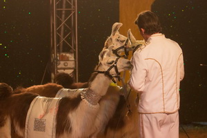 Drei Lamas, mit zierlichen Schabracken und Pailletten-Halsbändern top herausgeputzt, absolvieren einen variantenreichen Auftritt. Sie nehmen Leckerlis aus der Hand des Tierlehrers entgegen und bieten vielfältige Lauffiguren. Mit Sprüngen über eine immer wieder erhöht gehaltene Hürde endet der Auftritt eindrucksvoll.