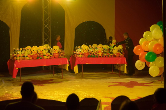 Monsieur Prein wendet sich an alle Tierfreunde und kommt damit zum heimlichen Programmhöhepunkt - der großen Tombola während der Pause. Das Chapiteau bleibt verschlossen und damit die allermeisten Besucher in seinem Innern. Die Tische mit den Gewinnen werden in der Manege positioniert und wortreich preist der Direktor die Lose an. Der Erlös aus dem Verkauf - ein Los zwei Euro, drei Lose drei Euro – komme ausschließlich dem Wohl der Tiere zu Gute. Bei solcherart moralischer Verpflichtung für alle „Tierfreunde“ finden die Lose reißenden Absatz. Keine Eltern, bzw. Großeltern die den Kindern dieses Vergnügen nicht bereiten und so wechseln die Trostpreise und Kleingewinne flott den Besitzer. Kaum hat sich die Aufregung im Gradin ein wenig gelegt, offeriert der Chef diverse Leuchtstäbe zum Kauf, da nur mit ihnen später die Clowns gebührend begrüßt werden können. Auch dieses Mal sind die Bemühungen von großem Erfolg gekrönt und nach wenigen Minuten, nachdem sich die meisten Besucher noch schnell mit Crêpes, Popcorn und Getränken versorgt haben, nimmt die Vorstellung ihren Fortgang.