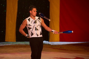 Kenny Cagniac überzeugt als versierter und vielseitiger Jongleur. Mit fünf kleinen Bällen eröffnet er seine Evolutionen. Im Anschluss folgen viele Muster mit bis zu sechs Ringen. Umfangreich ist sein Können mit Keulen. Die unterschiedlichsten Routinen erfolgen mir drei, vier und fünf Requisiten.