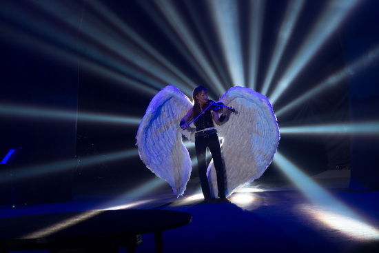 Das Opening wurde recht dramatisch gestaltet. Eine Geigerin, mit riesigen Engelsflügeln ausgestattet, spielt mitten auf der Bühne; sie wird von einer Korona gleißendes Lichtes eingerahmt, derweil etliche Artisten in silbernen Kutten sie immer enger umringen.