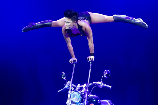 Melanie Chy kommt auf einer chromblitzenden Harley auf die Bühne gefahren. Nachdem das Motorrad auf einer Drehscheibe aufgebockt steht, arbeitet die sympathische Artistin kraftvolle Handstand-Equilibristik auf Handstäben, die an der Maschine angebracht sind. In exzellenter Ausführung erfolgen die verschiedenen Einarmer, Waagen und Handstände.