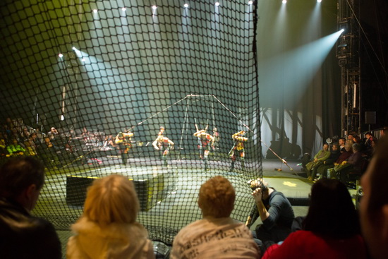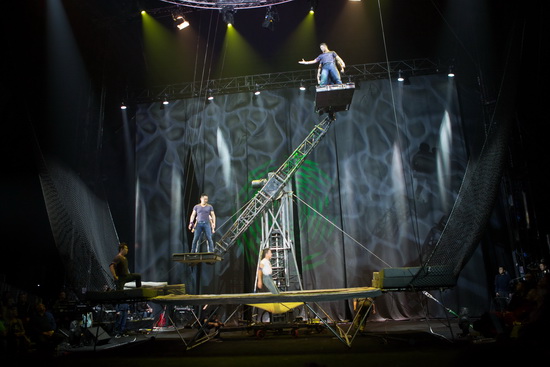 Die Truppe Jump war mit FlicFlac in der abgelaufenen Saison auf Tournee. Direkt nach der Pause zeigen sie ihre weiten Sprünge von der Russischen Schaukel, die im Hintergrund der Bühne steht, in ein Fangnetz unmittelbar vor dem mittleren Zuschauerblock.