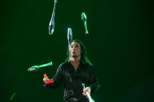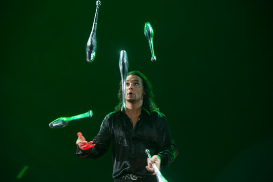 Tempojongleur Rudolf Janecek macht mit seinen rasanten Jonglagen noch einmal mächtig Stimmung gegen Programmende. In diesem Rahmen wurde seine Arbeit auf die Jonglage mit silbernen Keulen reduziert. Bis zu sieben davon hält der versierte Artist in hohem Tempo und in vielen verschiedenen Mustern in der Luft. Mit dem besonders schnellen drehen dreier Keulen schließt der Auftritt ab.