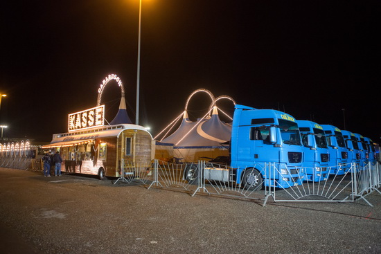 Nach dem Sommergastspiel in der Borsigallee war man mit dem Weihnachtscircus wieder auf den Frankfurter Festplatz am Ratsweg zurückgekehrt. Hell erleuchtet und großzügig aufgebaut bot der Circus in der klaren Winternacht ein stimmungsvolles Bild. Die hohen Bogen über den Masten von Chapiteau und Vorzelt sind mit unzähligen Lämpchen bestückt und tragen den funkelnden Circusnamen, zudem spannen sich Lichterketten von den Mastspitzen zur Erde. Kassenwagen und Fassade sind gleichfalls dekorativ illuminiert. Die MAN-Zugmaschinen sind in einer langen Reihe aufgefahren und die Transportfahrzeuge und Wohnwagen sind exakt ausgerichtet. Geräumige Stallungen und großzügige Paddocks ergänzen die Anlagen.