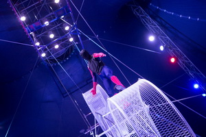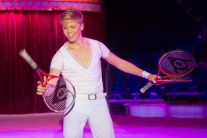 Kurze Zeit später ist die Stromversorgung wieder hergestellt und die unterbrochene Show nimmt ihren Fortgang mit Yuri Kovalchuks komischer Strapatennummer. In clownesker Weise als Operndiva herausgeputzt, fliegt Kovalchuk singend durch die Kuppel.
