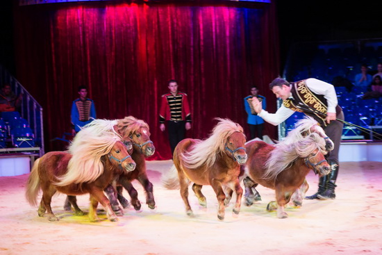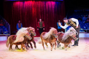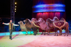 Zwei erstklassige hauseigene Dressurnummern sind im ersten Programmteil zu sehen. Manuel Frank lässt vier Kamele ihr erlerntes Repertoire temporeich zeigen. Sicher und gekonnt werden die verschiedensten Abläufe vorgetragen. Als Da Capo überspringen zwei Lamas an der Piste abliegende Kamele. Sechs dekorative Falabella-Pony stürmen gleich im Anschluss in die Manege. Munter agieren die Minipferde und zeigen sich als Barrierenspringer. Ein feiner Trick beschließt den Auftritt – ein Pony umläuft, scheinbar ohne Zutun des Vorführers, die Barriere und überspringt das Hindernis entgegen der vorgesehenen Laufrichtung.
