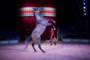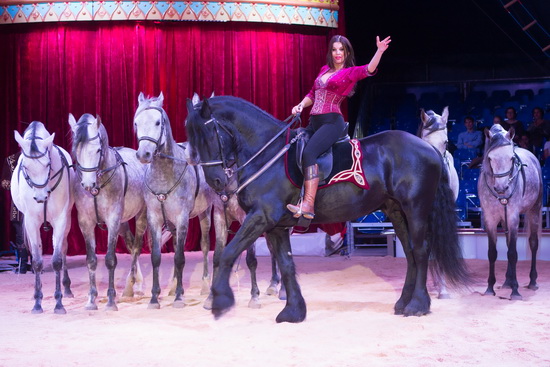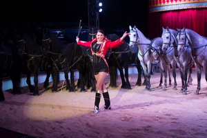 Einen Zwölfer-Zug Freiheitspferde präsentiert Natascha Wille-Busch im eleganten, reich mit goldenen Applikationen verzierten roten Frack. Je sechs Friesen und weiße Araber vereinen sich unter ihrer gekonnten Peitschenführung zu einem prächtigen Bild. Vielerlei Lauffiguren werden absolviert und erhalten durch das Spiel mit den unterschiedlichen Fellfarben der Pferde zusätzlichen Reiz. Kraftvolle Steiger der Araber runden die formidable Dressurdarbietung in idealer Weise ab.