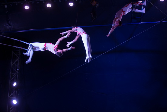 Für den fulminanten Höhepunkt vor der Pause war die Flugtrapez-Darbietung der Flying Regio platziert. Zwei Flieger und zwei Fänger, der zweite über dem Fliegertrapez platziert, boten eine große Vielfalt verschiedener Sprünge. Der zweite Fänger eröffnet den Voltigeuren mehr Möglichkeiten zur Gestaltung der Flüge und wird gut in den Ablauf eingebunden. Sehr sicher und elegant werden die zahlreichen Sprünge, darunter auch ein heute nur noch selten zu sehender doppelter Cutaway, ausgeführt. Ein dreifacher Salto und eine Passage bilden die Höhepunkte der Nummer.