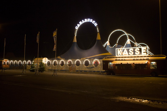 Zum zweiten Mal präsentierte die Familie Wille-Busch den "Great Christmas Circus" in Frankfurt am Main. Unzählige Lichter funkeln und glitzern an der Front, dem Chapiteau und den Weihnachtsbäumen am Eingangs bereich. Die Illuminieren des großen und eleganten Circus verbreitet in Dunkelheit weihnachtlich-festliche Stimmung.