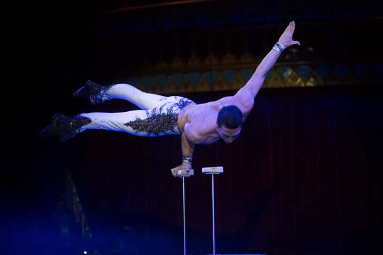 Christopher Togni arbeitet eine erstklassige Handstandequilibristik. Kraftvoll und elegant präsentiert er seine Kunst auf einem hohen, drehbaren Requisit. Sicher und gekonnt reihen sich die verschiedenen Handstandfiguren, Einarmer und Handstand-Waagen aneinander und mit einem spektakulären Klötzchensturz findet der Auftritt seinen gelungenen Abschluss.