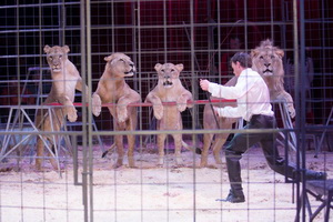 Hynek Navratil präsentiert seine Löwendressur nach der Pause. Die vier jungen Tiere beherrschen ein umfangreiches Repertoire gängiger Tricks. Mit sehr viel Schwung und vollem Einsatz lässt der junge Dompteur Pyramide, Balkenlauf, Bar, Sprünge, Teppich und weitere Aktionen ausführen. Mit eindrucksvollem hohen aufrichten am Gitter endet der Auftritt.