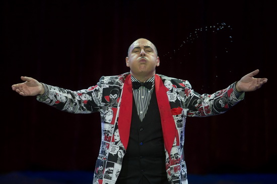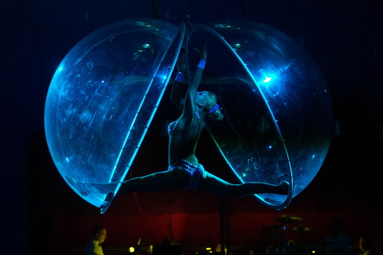 Sänger Yuri Kovalchuk intoniert Leonard Cohens „Halleluja“ und in einer hoch unter der Kuppel schwebenden großen Plexiglaskugel arbeitet Jamena Wille-Busch eine anmutige Trickfolge. Die anschließende Begrüßung des Publikums obliegt den Goty Clowns.