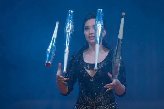 Die Tempojonglage von Sharon Berousek steht nun am Beginn der Show. Zunächst wirbelt die junge Frau einen Twirling-Stab umher. Alsbald tauscht sie diesen gegen schlanke silberne Keulen ein. Temperamentvoll werden die unterschiedlichen Muster gearbeitet und bis zu sechs Requisiten in der Luft gehalten.