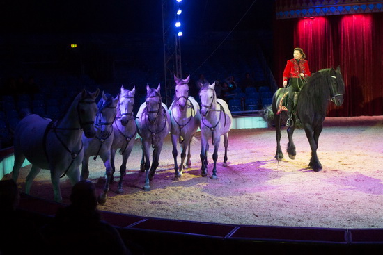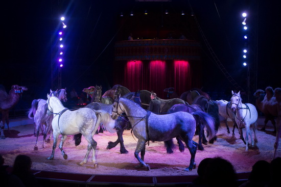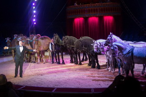 Eine hervorausragende neue Dressurdarbietung hat Manuel Frank zusammengestellt. Er startet seinen Auftritt mit dem bekannten Zwölfer-Zug Freiheitspferde. Je sechs Friesen und Araber bieten in Interaktion ein breites Spektrum unterschiedlicher Abläufe. Gekonnt und souverän ruft der äußerst erfahrene Tierlehrer die verschiedensten Lektionen ab und mit leichter Hand dirigiert er die zwölf Hengste. Nun kommen fünf Dromedare und ein Kamel hinzu und nach einigen Lauffiguren setzt Manuel Frank ein großes Karussell in Gang. Nachdem die Trampeltiere die Außenbahn eingenommen haben, formt der Dresseur aus den Friesen und Arabern zwei weitere Zirkel, so dass nun achtzehn Tiere in drei gegenläufigen Ringen ihre Bahnen ziehen. Ohne sichtbare Hilfen von Bereitern wird die Figur von Manuel Frank geformt – und auch wieder aufgelöst. Chapeau.