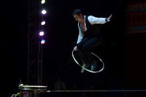Temperamentvoll agiert Eric Niemen auf dem Seil. Vielfältige Schrittfolgen prägen sein Scheingefecht mit einem Säbel, der nach weitem Schwung mehrfach hoch übersprungen wird. Zahlreiche weitere Sprünge – durch einen selbst gehaltenen Reifen und über eine hohe Hürde – werden perfekt ausgeführt und sicher auf dem labilen Untergrund gelandet. Ein erstklassig ausgeführter Rückwärtssalto bildet den Abschluss der gekonnt vorgetragenen Evolutionen.